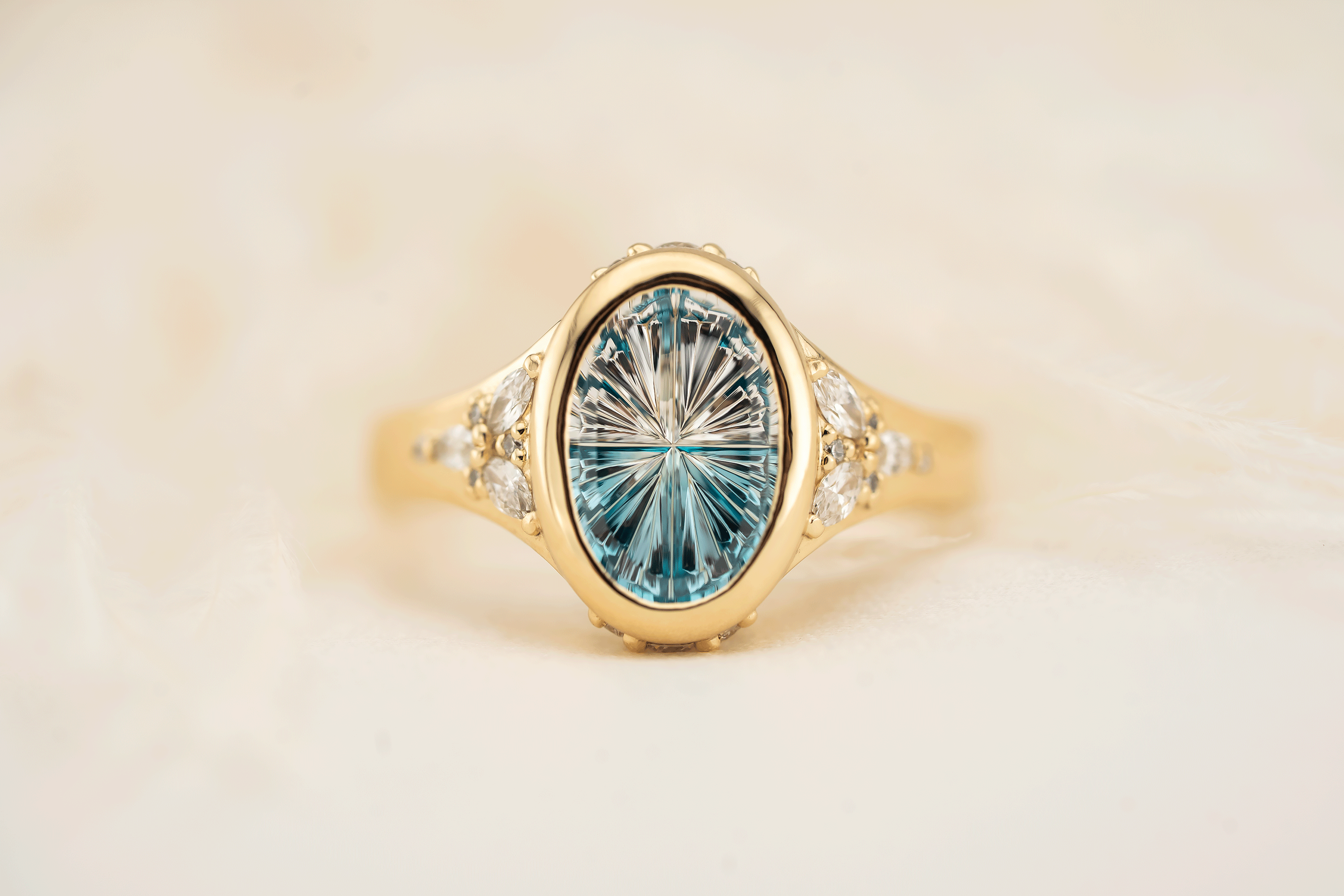 Natural diamond accents–totaling 0.33 carats, F VS–glimmer along the outside of the bezel like morning dew—something only seen by those who rarely wake to witness it. A subtle enchantment woven into every detail, this design feels both storied and eternal.