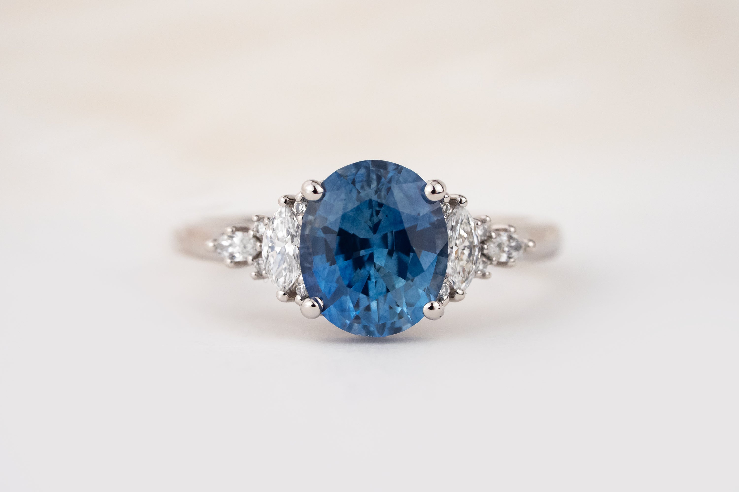 This version features marquise cut light blue sapphires, paired with standard prongs.