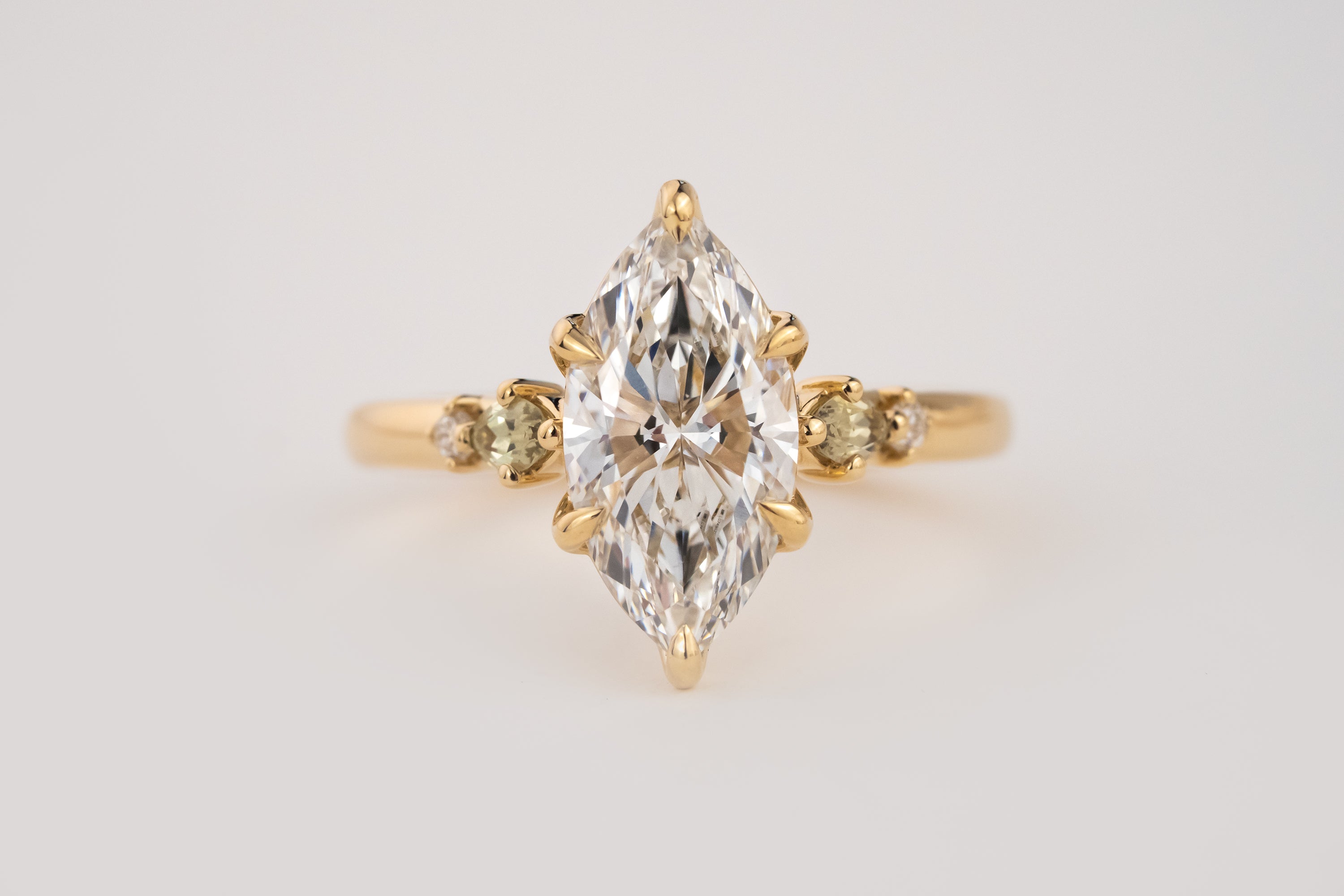 • Wedding Band Pairing: The slightly elevated setting is designed to allow our plain flat wedding band to sit flush. We cannot guarantee compatibility with wedding bands from other jewelry brands.